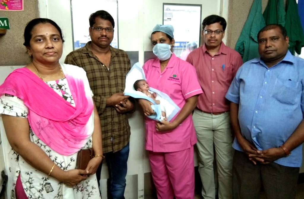 Baby of Ramya, gestational age 40 weeks with birth weight 2.7 Kgs, diagnosed as Post Op case of Omphalocele with Right Pneumothorax with ICD in Situ, Neonatal Seziures, Bilateral Germinai Matrix Bleed with PPN. Discharged after 15 days of care from Suraksha Hospital. Seen in the picture (L to R): Ms. Prathima, Principal, Sri Chaitanya Educational Institutions, Mr. Raj Kumar, father (daily labour), Ms. Eshwari Jyothi, NICU in-charge holding the baby, Dr. Shashi Kumar and Mr. Venkata Ramana, Principal, Sri Chaitanya Educational Institutions.